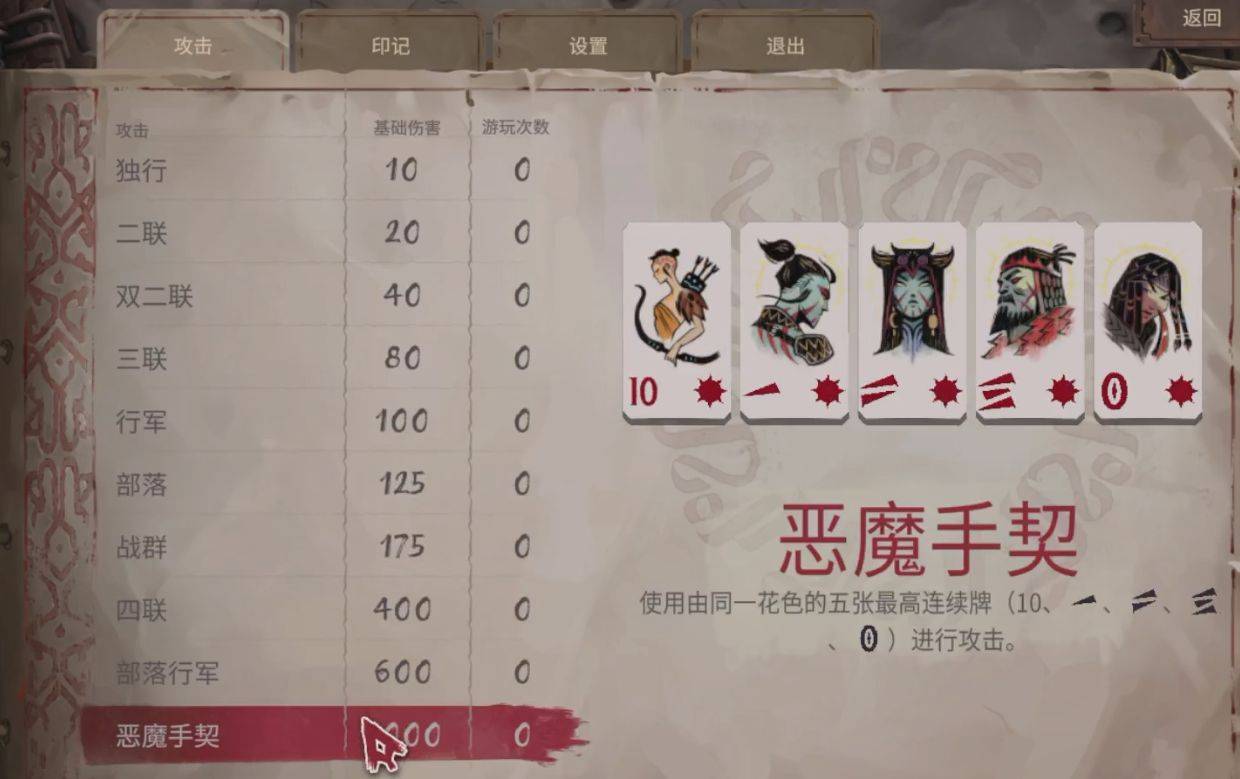 在《恶魔手契》中,玩家每场游戏开始时的生命值,是依据其在整个迷你游戏中的进度来确定的。每一轮,玩家都要从一副包含52张牌的牌组中抽取8张牌,通过组合这些牌,形成不同等级的攻击,从而对对手的卡牌造成伤害。每轮玩家还拥有三次弃牌机会,每次最多可弃五张牌。之后,系统会根据玩家的各种攻击数值,以及所组合出的卡牌类型来计算并造成相应伤害。每场战斗结束后,玩家会获得一定数量的货币,这些货币可用于购买能增强游戏各方面效果的印记。游戏的回合会一直持续,直到玩家或电脑的血量降为0点,这场对局才会分出胜负。