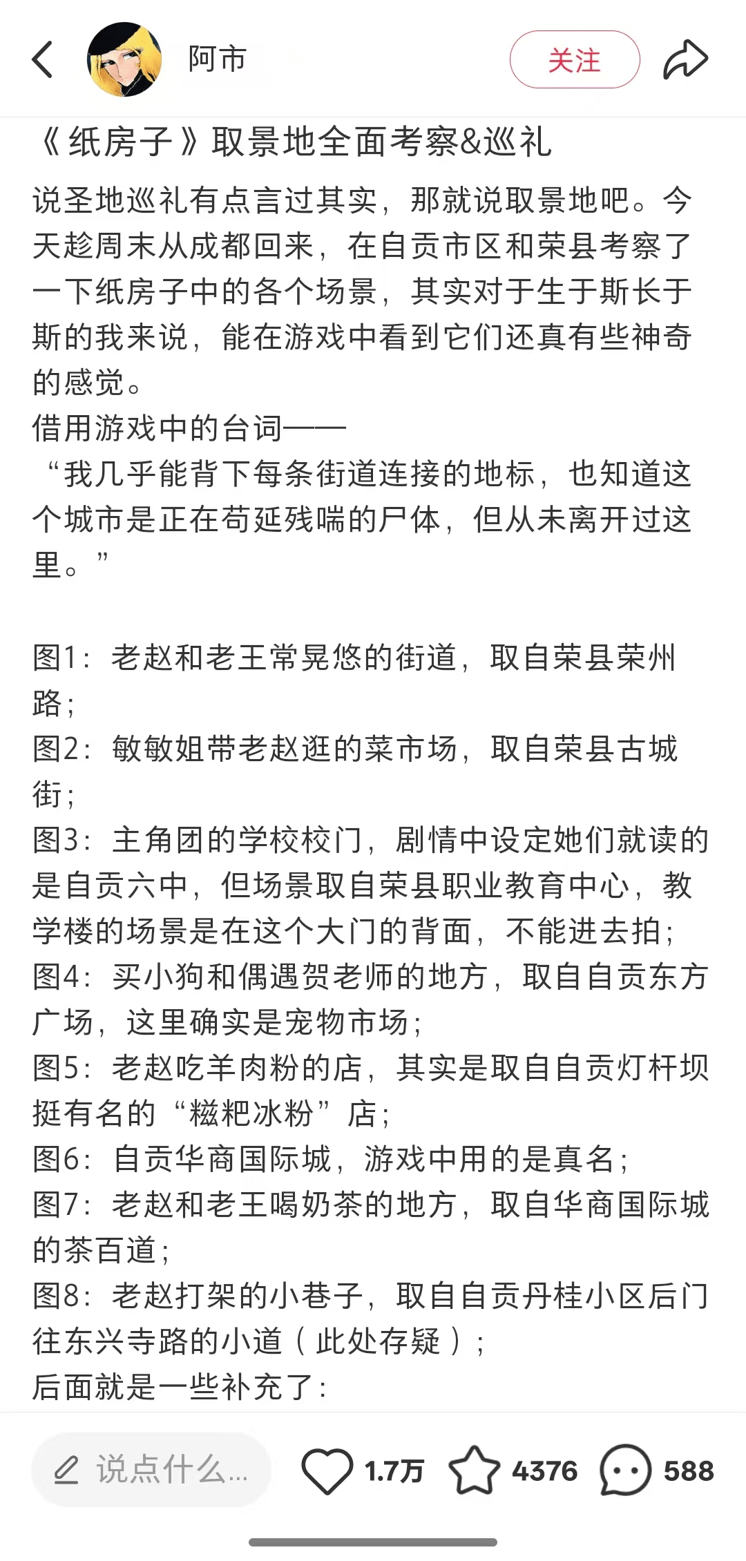游戏中的角色、剧情等要素能够为日常情景附加独特的情感价值,在玩家的自主考据与发掘中创造全新的文旅消费热点。《女神异闻录5 乱战 魅影攻手》中主角团“心之怪盗团”乘坐房车环游日本的经历吸引玩家自发复刻旅程。取材自四川自贡的《纸房子》使普通的街道、市场、校门与宠物市场等场景,玉米嫩兔、土豆凉面等游戏角色生活日常中出现的本土菜品,成为了异地玩家们相通的情感记忆。以“回到小时候街道的梦”为灵感做成的中式写实风梦核游戏《无人》小红书发布帖单篇获赞3.6万,游戏将名为“一米阳光”的小店、弧形窗户、红白墙砖等“全国统一”童年记忆凝聚在建筑建模中,吸引玩家纷纷打卡分享身边的相似场景。游戏已不止于创造虚拟世界,更成为现实空间的增值引擎,它能将最平凡的日常场景“点化”为承载集体记忆与消费热情的文旅新地标。